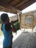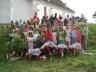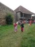 Itt egyensúlyozással. Szép idő van, az esőköpeny csak óvintézkedés, mert a fejünkön levő pohárban vizet viszünk.